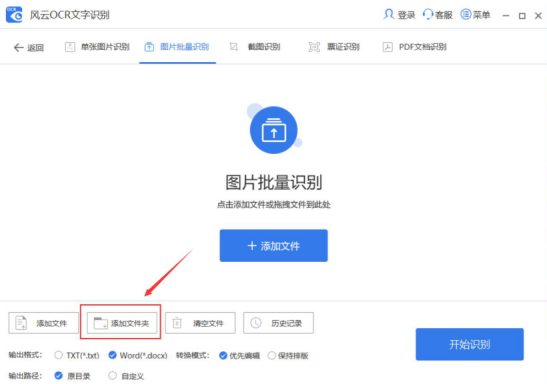 3.接下来,在风云OCR文字识别中,点击“添加文件夹”按钮将需要识别文字的图片批量导入。