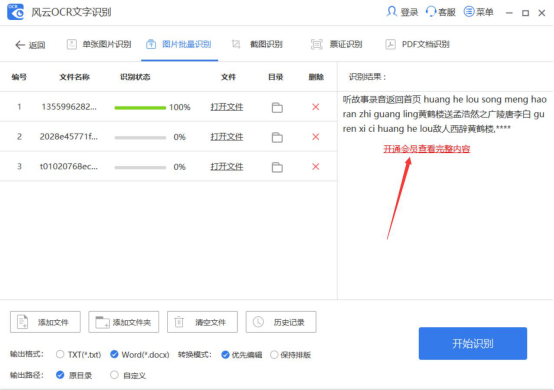 7.最后,图片识别文字完成后,再在风云OCR文字识别的右侧窗口中点击“开通会员查看完整内容”。开通会员后即可查看完整的图片识别文字的结果了。