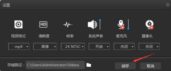 4.进入录大咖的设置页面后,用户根据自己的录制需要,设置视频格式、清晰度、帧率和是否开启系统声音、麦克风、摄像头,再设置视频录制后的存储路径,都设置完后,点击“保存”按钮。