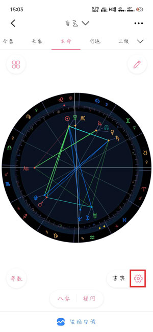 2.进入本命星盘后,此时看到的星盘为四分仪(placidus)星盘,点击右下角的齿轮【设置】;
