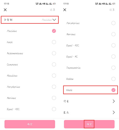 3.进入设置页面后,点击【分宫制】,将其切换为【Whole】,whole就是整宫制,点击【确定】;