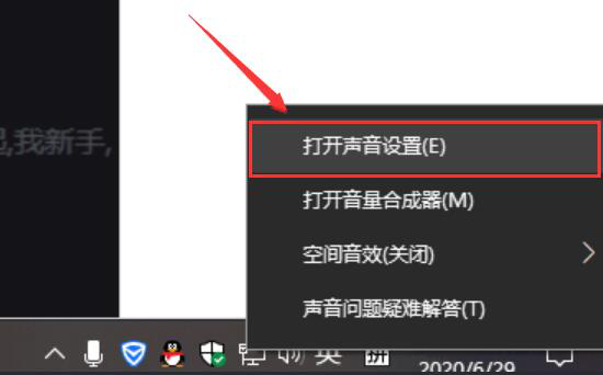 1.在任务栏右下方点击小喇叭图标打开它的菜单,从菜单中点击“打开声音设置”。