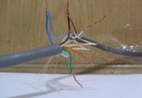 之后的方法需要将网线的铜芯露出来,将网线一头的水晶头剪掉,然后再剪掉最外层的胶皮,长度越长2CM,剪掉胶皮后露出里面的8根不同颜色的网线,再依次将网线的胶皮剪掉,露出铜芯即可,此次剪掉的胶皮长度可以自定定义。