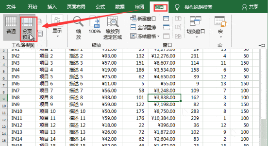 1、点击菜单栏中【视图】,在工作簿视图选项组中点击【分页预览】。