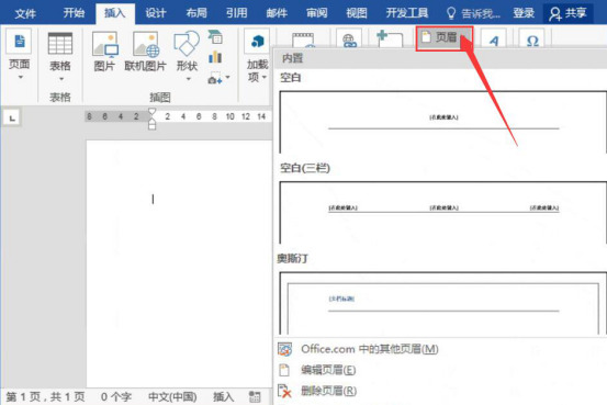 1.首先,用户新建一个word文档,点击“插入”菜单中的“页眉”,从页眉样式中选择空白页眉。