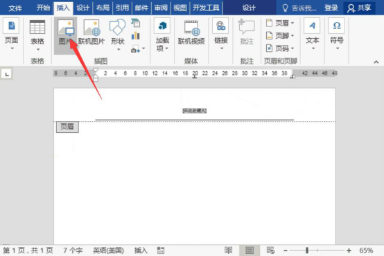 2.然后,点击页眉,让页眉处于可编辑的状态,再点击“插入”菜单中的“图片”,将word自定义页眉样式时会用到的图片素材导入。