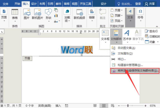 5.接下来,点击“插入”菜单中的“文本”,并从文本子菜单中点击“文档部件”中的“将所选内容保存到文档部件库(S)”。
