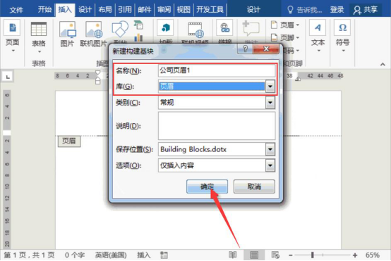 6.此时,word会弹出新建构建基块窗口,从中设置自定义页眉样式的名称,“库”的下拉菜单中选择“页眉”,再点击“确定”按钮,word自定义页眉样式便成功保存起来。
