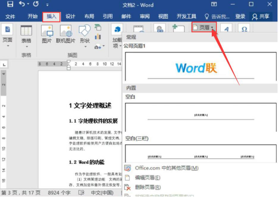 7.当我们编辑其他word文档的时候,想要采用自己自定义的word页眉样式,就可以点击“插入”菜单中的“页眉”,便可以看到该样式,点击它即可应用。