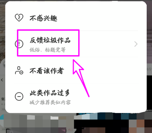 长按小视频,弹出菜单选项,点击【反馈拉圾作品】,