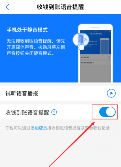 如图,点击开启【收钱到账语音提醒】,选择其中一种语音,还可以试听效果,