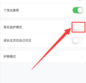 4.这时候我们就能看到一个“家长监护模式”了,点击下后面的按钮,让其处于打开状态。