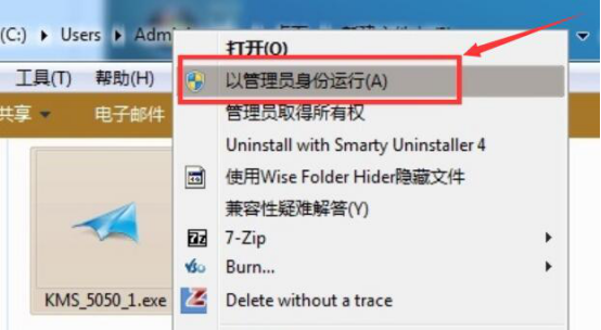 1.首先,将自己下载的小马kms8安装包解压。解压后右键单击“KMS_5050_1.exe”应用程序,并在右键菜单中点击“以管理员身份运行”。