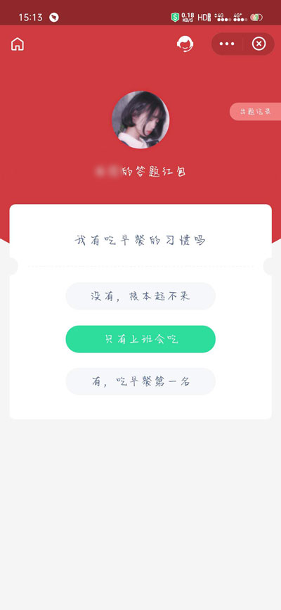 2、然后在对方询问的问题中,需要选择对方设置的正确答案,选择正确的答案之后,我们才可以领取对方的答题红包(答案背景色变绿色表示回答正确);