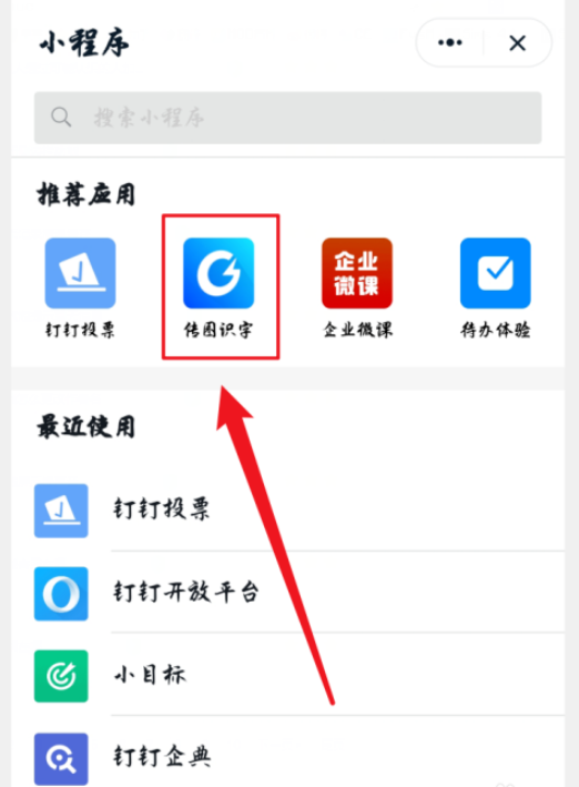 2、现在进入更多页面,如图,点击【小程序】选项,找到【推荐应用】——【传图识字】,