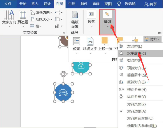 3.然后,和大家讲解word排版时,图片如何竖向和横向居中对齐。先将需要对齐排列的图片选中,再点击“布局”菜单中的“排列”,并从众多的排列方式中点击“水平居中”。