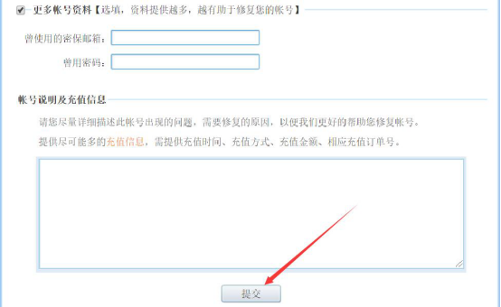4.最后,尽量填写曾使用的密保邮箱、密码,并完善账号说明及充值信息,再点击“提交”按钮。因为资料提供越多,快玩游戏盒提交申诉资料后,审核的过程会越快,而且也更有助于账号修复。