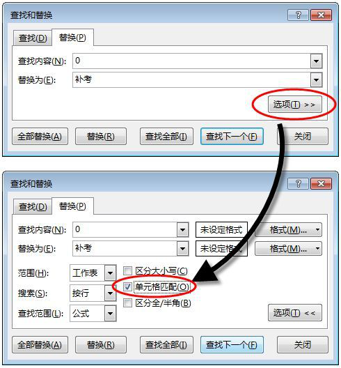 4、应该如何办呢?首先使用快捷键【Ctrl + Z】撤销刚才的替换,然后重复上述操作,使用快捷键【Ctrl + H】再次调出【查找和替换】窗口,在“查找内容”后输入“0”,“替换为”后输入“补考”,接着点击【选项】,这时窗口会向下扩展,勾选“单元格匹配”,最后点击【全部替换】。