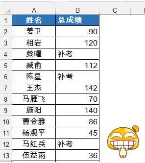 1、这里我们以一个班成绩为例,比如我们将考0分的成绩全部替换“补考”