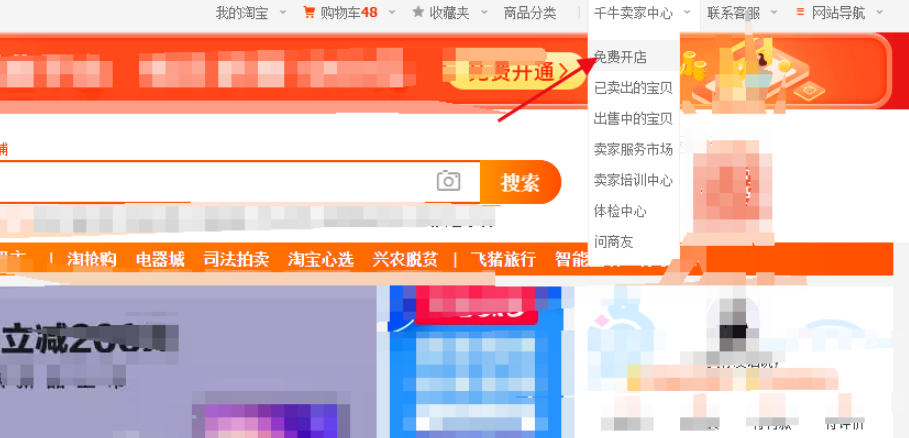 打开淘宝网,点击登录个人账号,成功登录之后,点击右上角的【千牛卖家中心】,选择【免费开店】,