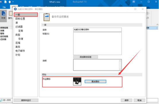 3.然后,在Backup4all Lite的属性窗口中,切换至“一般”选项卡,点击“更改图标”按钮可以设置备份的作业图标。