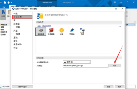 5.接下来,再切换至Backup4all Lite的“目标位置”选项卡,选择将数据备份的目标位置。这里点选“本地磁盘”,再点击“浏览”按钮选择具体的目标文件夹,如下图。