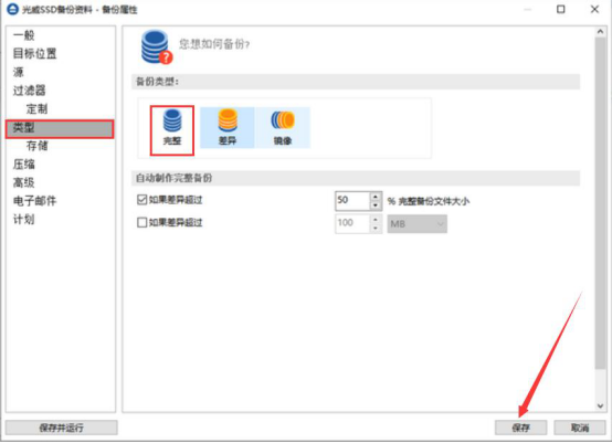 6.Backup4all Lite备份的目标位置设置完成后,接着,我们切换至“类型”选项卡。点选“完整”的备份类型,再点击“保存”按钮,从而完成Backup4all Lite备份任务的创建。