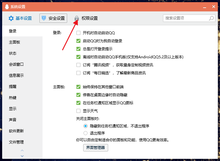 进入系统设置界面,点击上方【权限设置】,