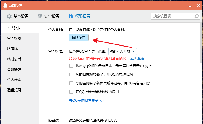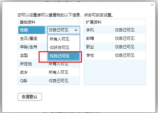 然后选择【个人资料】——【权限设置】,弹出窗口,设置基础资料,点击【性别】,选择仅自己可见,
