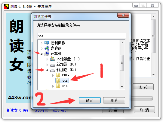 5.进入朗读女安装程序,将安装路径设置【tts】文件夹中,然后点击【确定】。