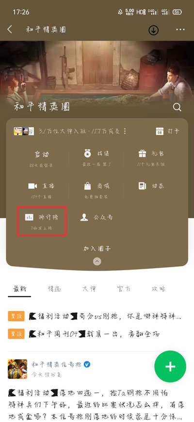 5、点击游戏进入游戏圈,选择查看【排行榜】;