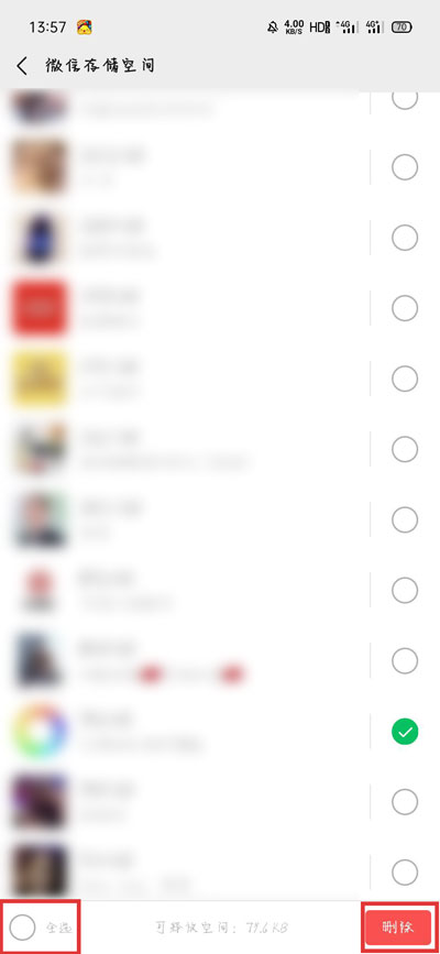 5、如果需要清理聊天文件,点击聊天记录右侧的【管理】,然后勾选需要删除聊天记录的联系人,点击右下角的【删除】即可;