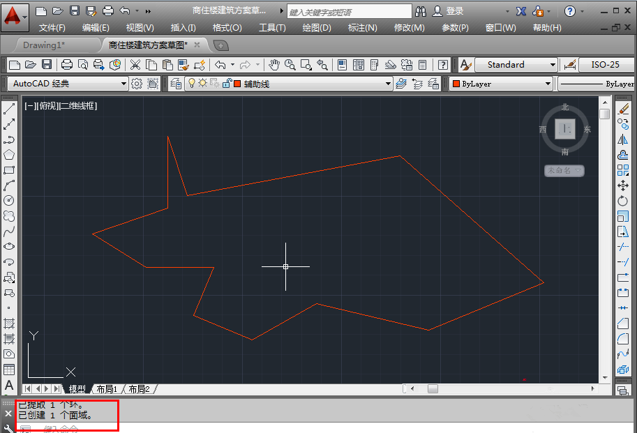 4、如图,左下角显示成功创建一个面域,创建面域后,对象为一个整体,可以进行面域的相关操作,