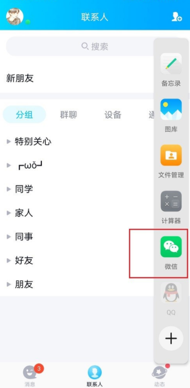 开启智慧分屏之后,选择一个软件应用(QQ),从屏幕的右侧向左滑,出现应用栏,选择分屏的应用,这里选择微信,