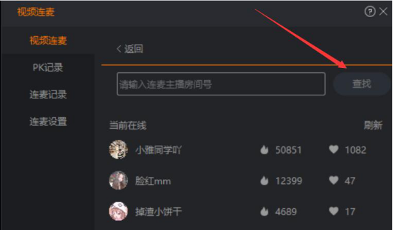 2.然后,进入斗鱼直播伴侣的“视频连麦”界面,输入想要连麦的对方直播的房间号,再点击“查找”按钮。