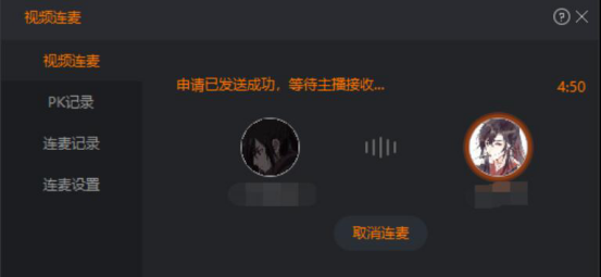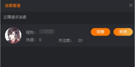 5.当对方主播收到视频连麦的邀请后,接受的话就点击“同意”按钮,不同意则点击“拒绝”按钮。如果超过5分钟对方主播都没有处理连麦邀请,则会默认为拒绝。