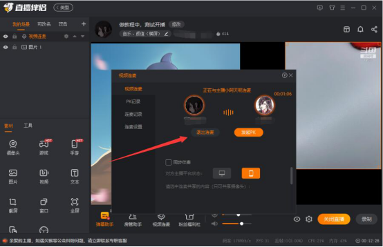 6.如果对方直播同意了视频连麦邀请,则在斗鱼直播伴侣的视频直播预览窗口中,可以看到连麦效果。默认是左右分屏,主播也可以根据自己的情况来调整布局,不过要注意用户的视角是和主播视角是一致的。