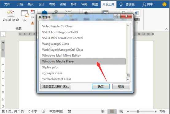 2.在“其他控件”的窗口中,点选“Windows Media Player”这款控件,并点击“确定”按钮。