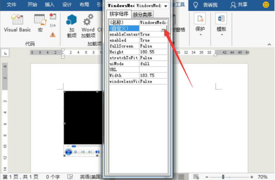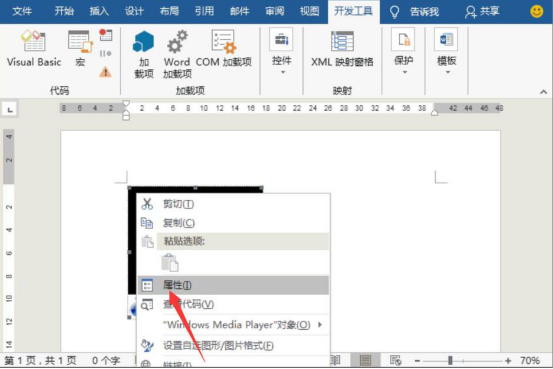 3.然后,返回word文档窗口。右键单击所应用的视频播放器,并在右键菜单中点击“属性”。