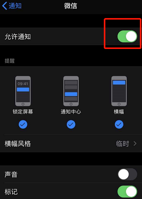 进入微信通知页面之后,首先确认【允许通知】功能是开启状态,