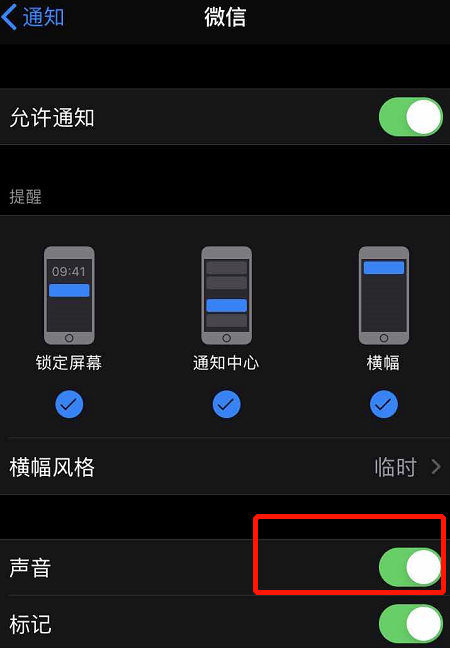 然后点击下方的【声音】选项,将其打开,这样就不会影响微信的二维码收款语音到账提醒功能。