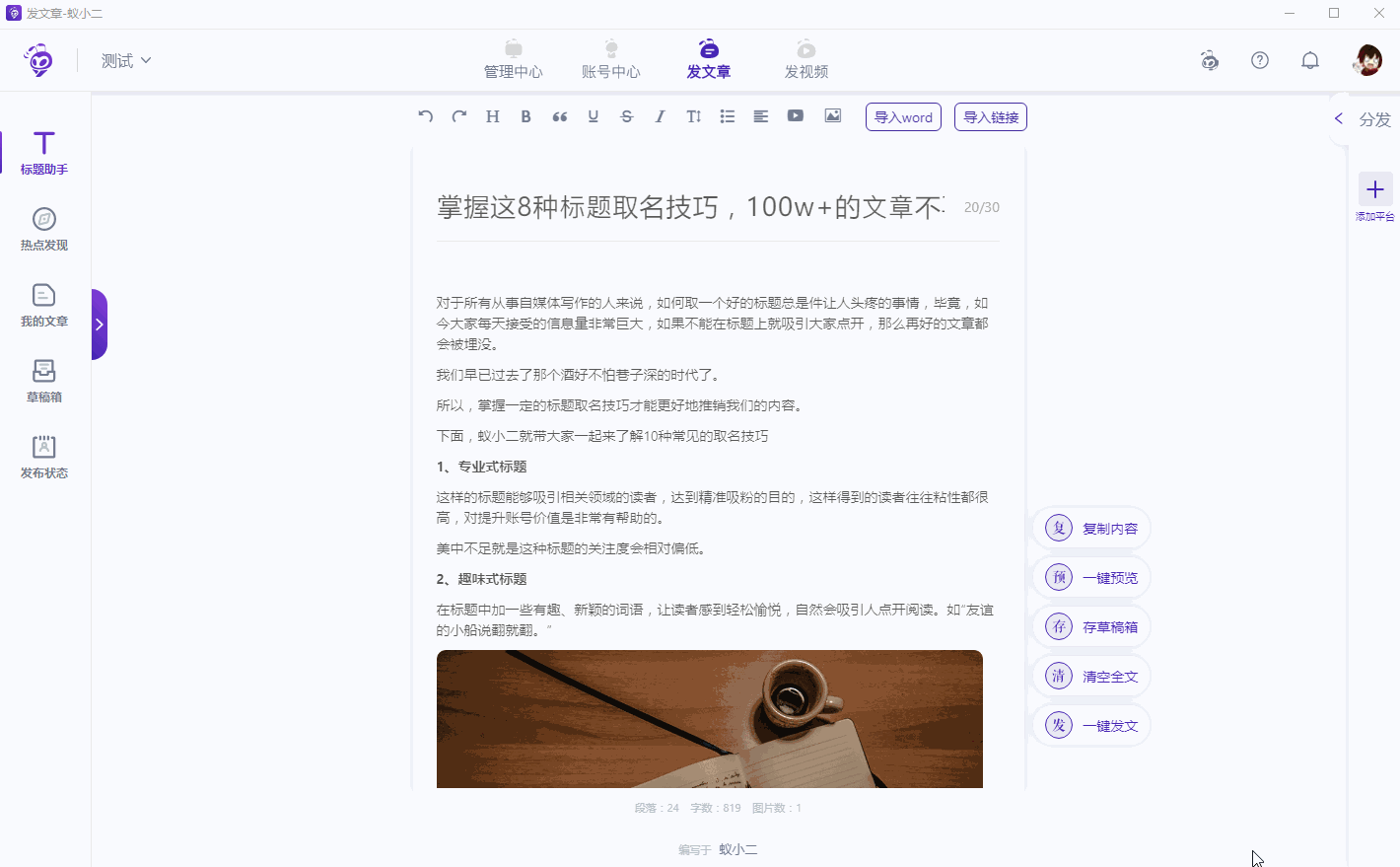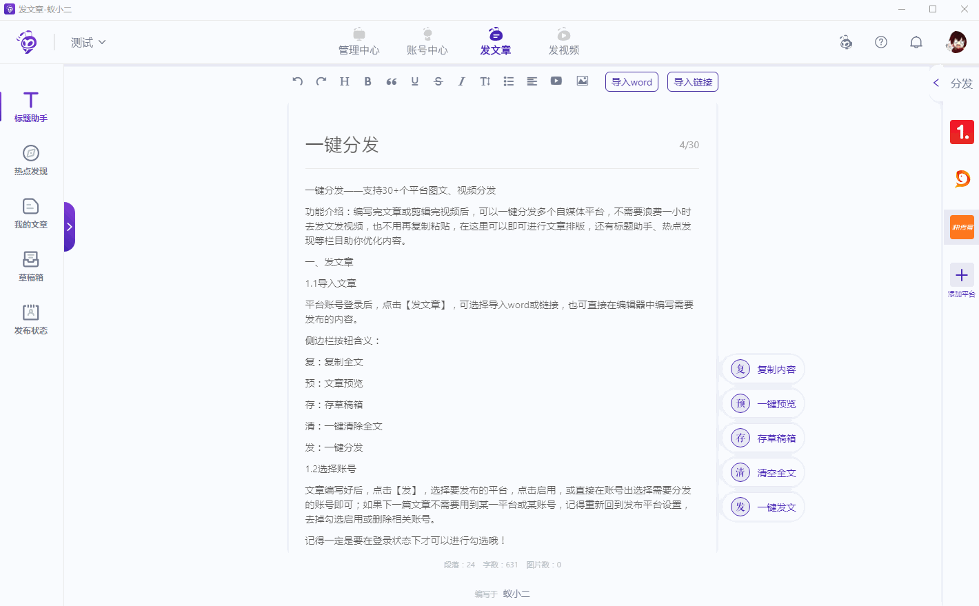 打开蚁小二一键分发系统,登录账号,进入管理中心,点击【发文章】,跳转窗口,你可以点击【导入word】或者【导入链接】,也可以直接编写内容,蚁小二提供了一系列的编辑排版功能。