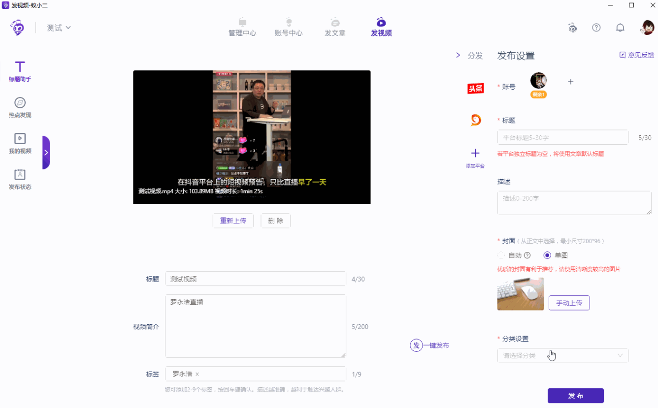 点击【发视频】,进入窗口,选择【添加本地视频】,设置视频标题、简介、标签等信息,然后点击【一键发布】,选择对应账号,一定要注意视频的格式!