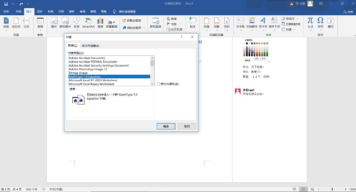1、首先我们下载并安装MathType,打开我们的word文档,点击菜单插入|对象,在弹出的对象选择框中,然后选择我们已经下载好的MathType点击确定即可。