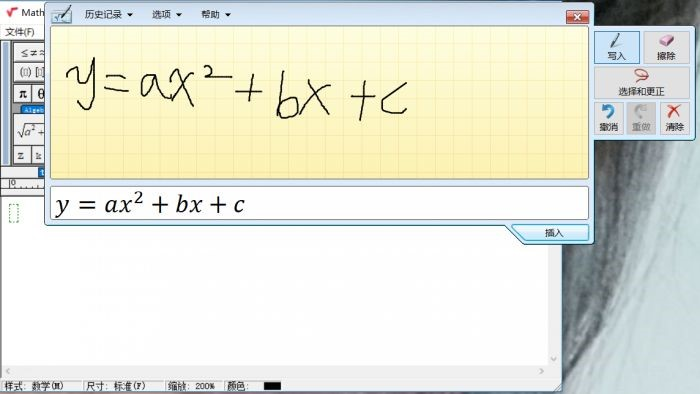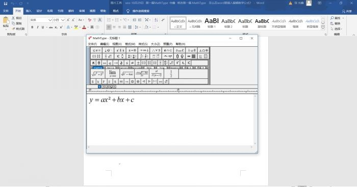 3、接下来用MathType编写函数就更加的简单了。有了它想要完成数学函数公式编写工作简直是轻而易举。比如我们想要在word中插入一个数学函数公式如y=ax²+bx+c,我们可以用MathType上方有的公式和符号进行编辑,公式符号真的是超级的全。