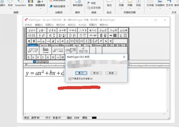 4、关闭公式编辑框时,系统给出提示,点击是,并勾选下方的“不再显示此对话框” 这样在word正文中出现我们刚才所输入的公式,这样我们就轻松的完成了用MathType编写函数并成功地插入了word中。