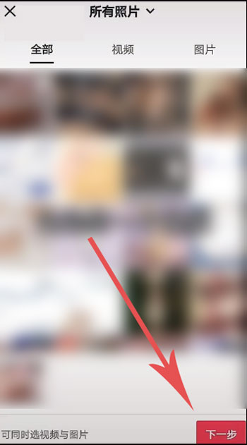 7、选择提前拍摄的视频,需要选中视频或者图片,点击右下角的【下一步】;