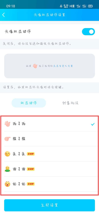 5、最后在双击动作设置中,选择【拍一拍】,也可以选择修改为亲了亲、抱了抱、舔了舔等等,还可以选择【创意玩法】;