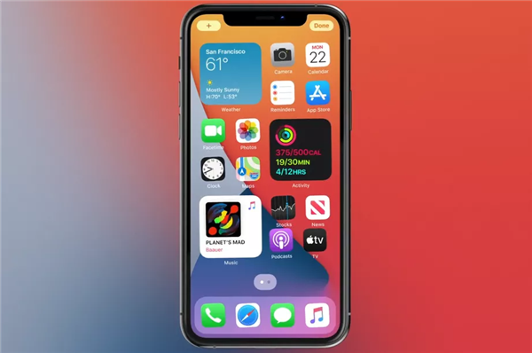 在iOS 14中,苹果引入了新的主屏幕界面,允许添加小部件,小部件可层叠等。其他新功能还包括应用程序库、来电/Facetime以小窗形式通知、免下载使用应用程序、11中语言的翻译软件、自带地图可进行自行车导航、汽车钥匙功能等。
