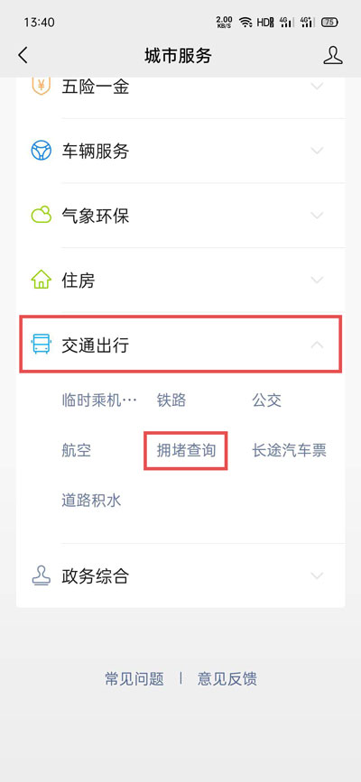 3、然后在上方更换定位城市,下滑展开【交通出行】,选择【拥堵查询】;